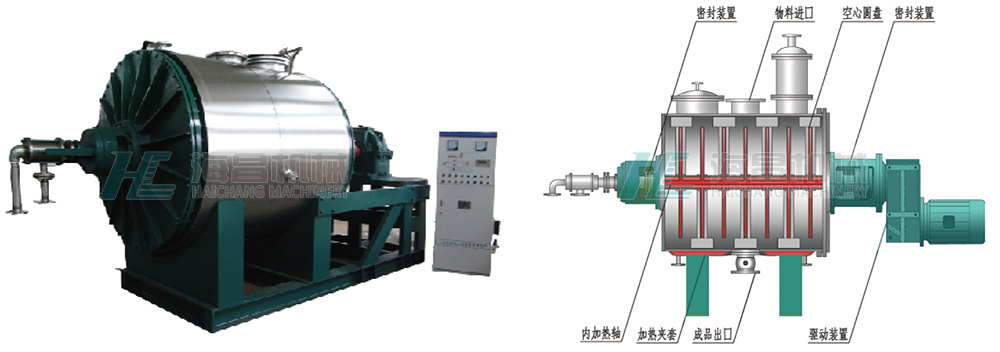 本機的主要結構如圖所示,在一個帶夾套的臥式容器內安裝有空心軸和許多空心圓盤(或螺帶)攪拌裝置及攪拌機構,這些空心圓盤(或螺帶)攪拌裝置在驅動裝置的帶動下與空心軸及攪拌機構一起旋轉。